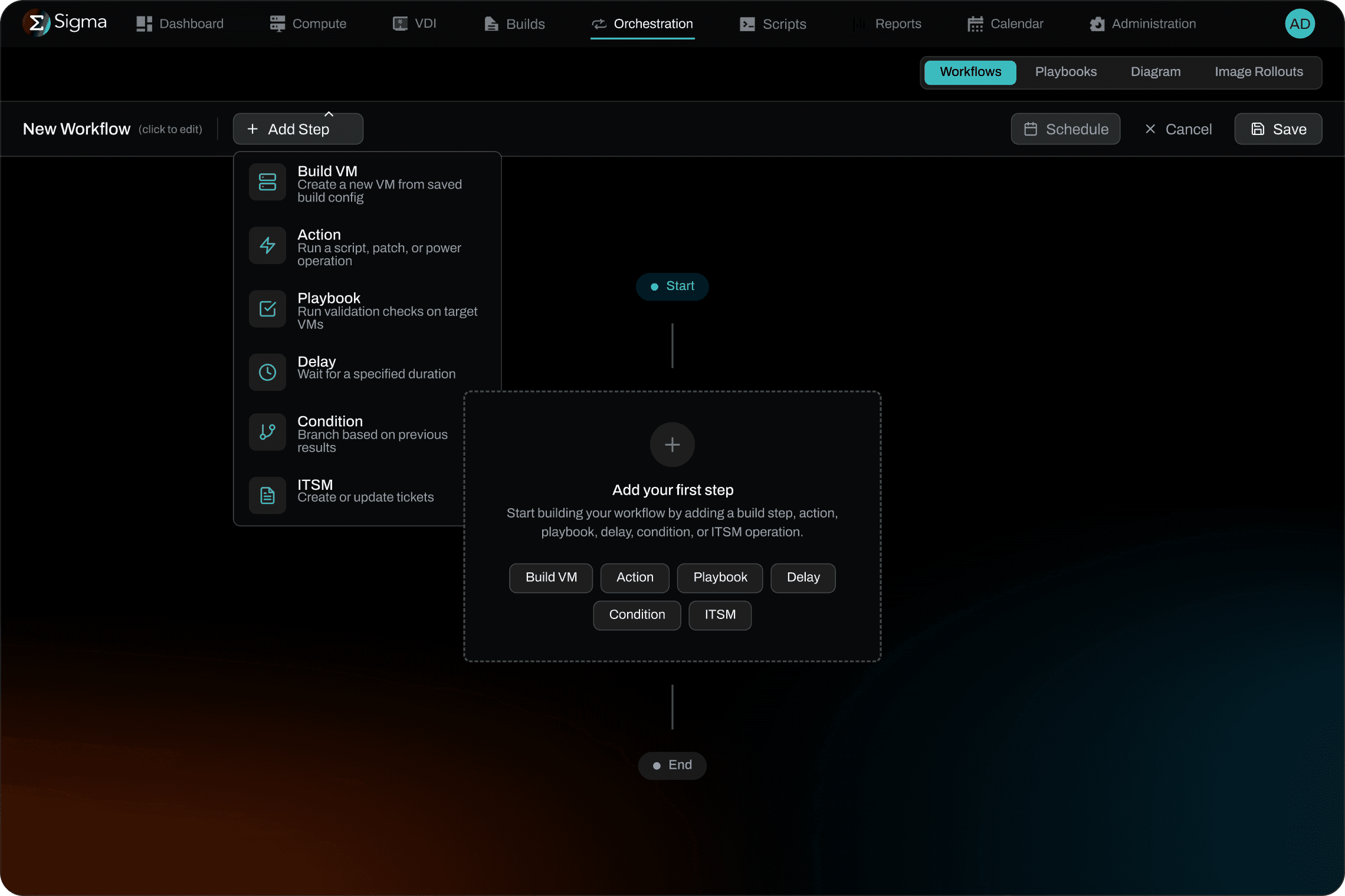 Sigma gives enterprise IT teams a no-code, agentless way to orchestrate VM, VDI, patching, and troubleshooting workflows across hybrid environments.